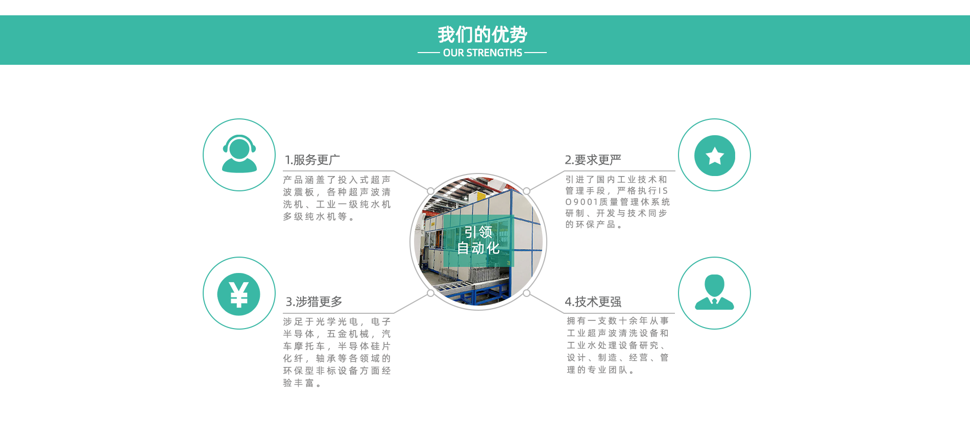 天津市引領(lǐng)自動化科技有限公司是由一支擁有數(shù)十余年工業(yè)超聲波清洗設(shè)備和工業(yè)水處理設(shè)備研究、設(shè)計、制造、經(jīng)營、管理、銷售、服務(wù)于一體的企業(yè)。 公司匯集了一批長期致力于工業(yè)清洗設(shè)備和工業(yè)水處理設(shè)備研發(fā)、設(shè)計、制造的人才,引進(jìn)了國內(nèi)外的工藝技術(shù)和管理手段,嚴(yán)格執(zhí)行ISO9001質(zhì)量管理體系,研制、開發(fā)與技術(shù)同步的環(huán)保產(chǎn)品。選用日本、美國等原材料、元器件,以設(shè)備、熱忱的服務(wù)、合理的價格為廣大用戶提供質(zhì)量穩(wěn)定、外形美觀的十多個系列、百余個規(guī)格的超聲波清洗設(shè)備、高壓噴淋清洗設(shè)備、工業(yè)水處理設(shè)備。產(chǎn)品涵蓋了投入式超聲波震板,單槽式超聲波清洗機(jī)、多槽式超聲波清洗機(jī)、氣相型清洗機(jī)、自動型超聲波清洗機(jī)、碳?xì)漕惓暡ㄇ逑礄C(jī),高低壓噴淋清洗機(jī)等以及工業(yè)冷水機(jī),工業(yè)一級純水機(jī)多級純水機(jī)等。 產(chǎn)品具備完善的售前,售中,售后服務(wù)制度。尤其在開發(fā)設(shè)計光學(xué)光電,電子半導(dǎo)體,五金機(jī)械,汽車摩托車,電池,半導(dǎo)體硅片,化纖,軸承等各領(lǐng)...